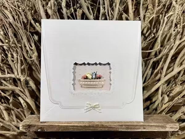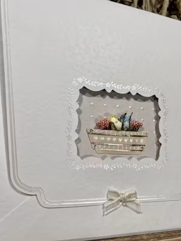 Προσκλητήριο γάμου πολυτελείας, ειδική κατασκευή φάκελος με κοπτικό, κάρτα δίπτυχη ντουμπλαρισμένη με εσώκλειστο οντουλέ χαρτόνι, εκτυπωμένα ανάγλυφα περλέ λουλούδια, και εσώφυλλο κειμένου.
