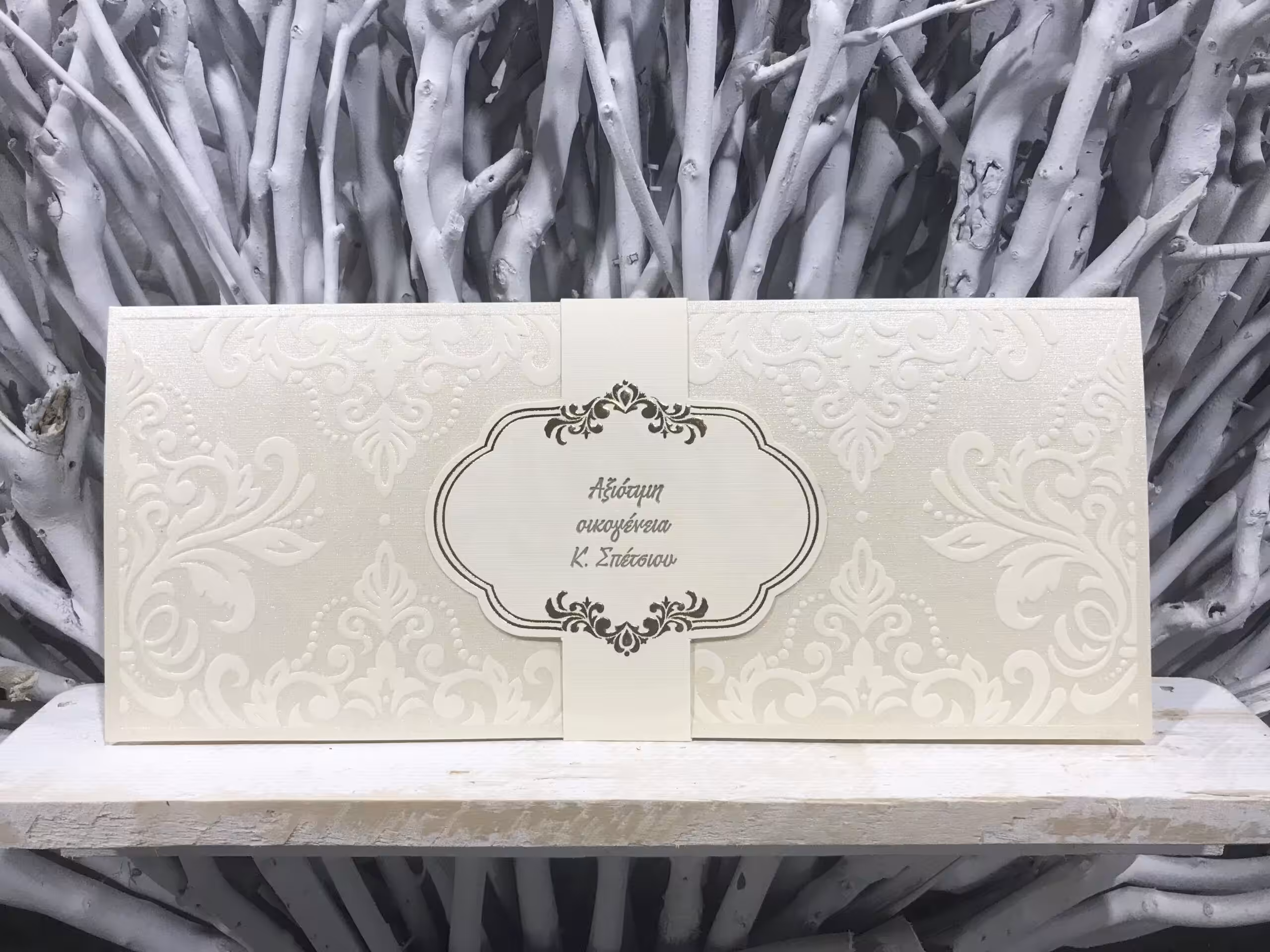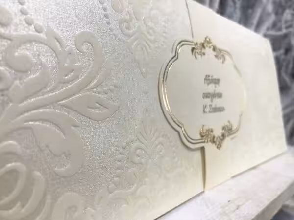 Προσκλητήριο γάμου δίπτυχο παραλληλόγραμμο με γκοφρέ ματ σχέδια σε περλέ φόντο και ζώνη κλεισίματος με σχέδιο χρυσοτυπίας και γκοφρέ για τα ονόματα των καλεσμένων.