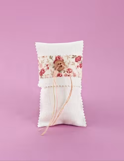 [mc4wp_form id="4607"]Πουγγί όρθιο μισό λευκό-μισό με τριαντάφυλλα, διακοσμητικό κουμπί, 7 κουφέτα απλό αμύγδαλο