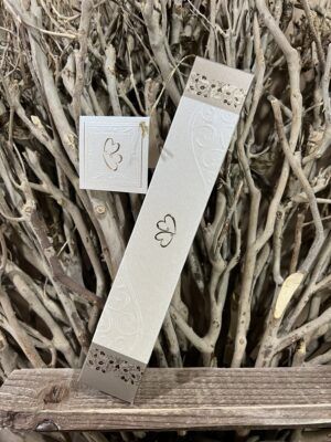 Προσκλητήριο γάμου πάπυρος με συρταρωτό κουτί, με καρδιές τυπωμένες με χρυσοτυπία, τόσο στο προσκλητήριο, όσο και στο κουτί. Το κουτί επίσης διακοσμείται και με γκοφρέ λεπτομέρειες.
