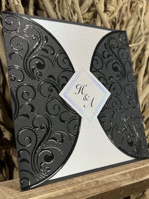 Εντυπωσιακό προσκλητήριο γάμου με τρίπτυχη κουμπωτή θήκη σε μαύρο χρώμα, με ανάγλυφα σχέδια και εσωτερική κάρτα σε χαρτί μέταλ λευκό με λεπτομέρειες ασημοτυπίας.