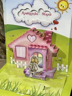 Προσκλητήριο γάμου χιουμοριστικό, δίπτυχη κάρτα με τρισδιάστατη παράσταση.