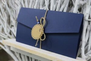 Προσκλητήρια βάπτισης 3πτυχο με θέμα μάτι, σε συνδιασμό χρωμάτων blue black – eco brown, διακοσμημένο με σπάγγο, ματάκι και καρτελάκι για το όνομα της οικογένειας.