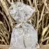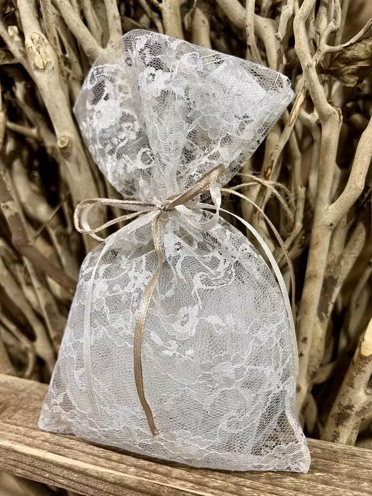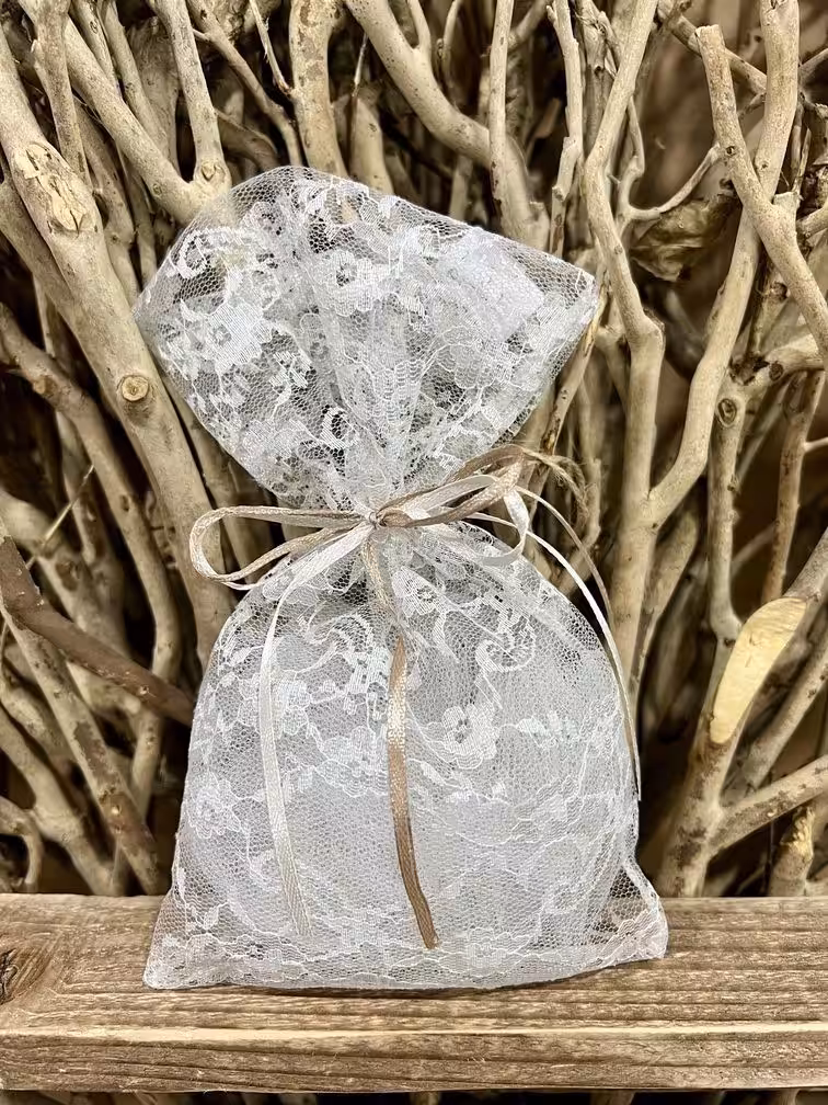Μπομπονιέρα γάμου με δαντέλα τριαντάφυλλο, διπλός σατέν φιόγκος και εσωτερικό τούλι.