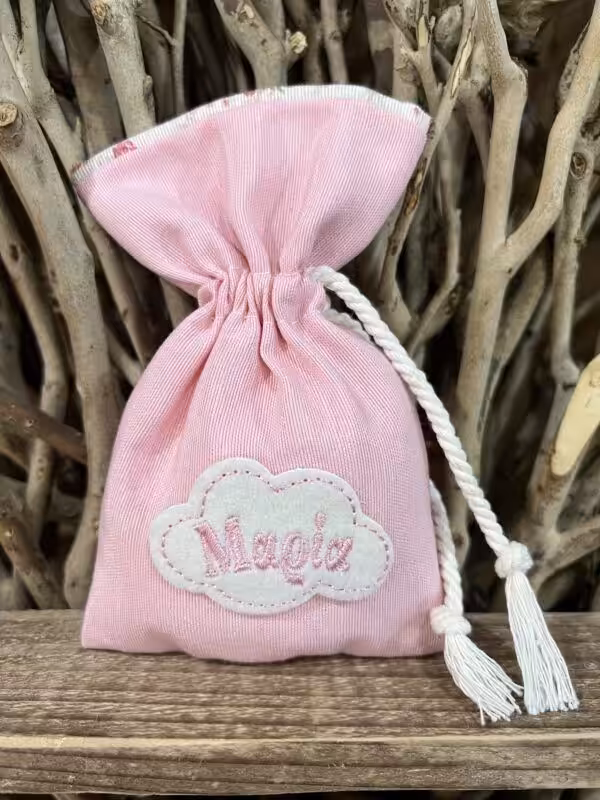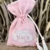 Μπομπονιέρα βάπτισης πουγκάκι με σούρωμα, κορδόνι και κεντημένο όνομα.