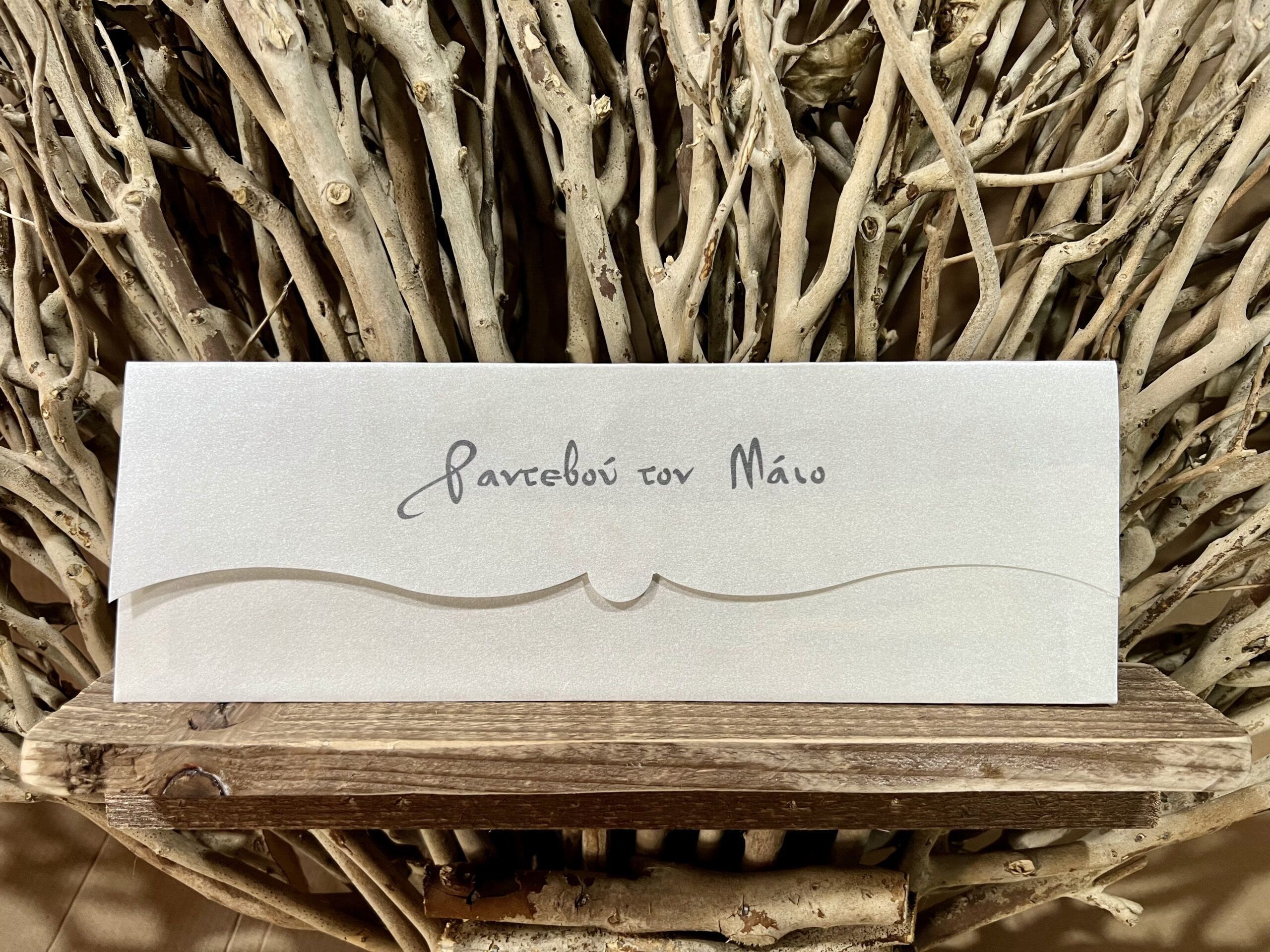 Προσκλητήριο γάμου με κυματιστό κλείσιμο φακέλου, από χαρτί μέταλ σε χρωματικό συνδιασμό λευκό – ασημί.