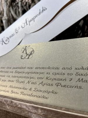 Προσκλητήριο γάμου με κυματιστό κλείσιμο φακέλου, από χαρτί μέταλ σε χρωματικό συνδιασμό λευκό – ασημί.