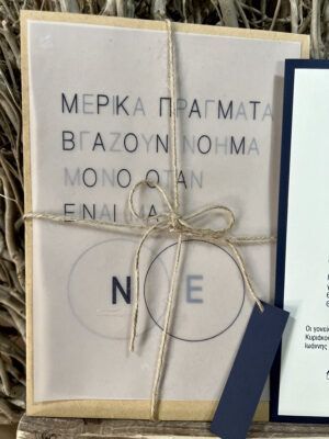 Διπλή λαμιναρισμένη κάρτα σε χρωματικό συνδιασμό μπεζ – blue navy, σε φάκελο-σακούλα με τυπωμένο κρυπτόλεξο σε ριζόχαρτο και το φάκελο.