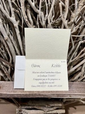 Δίπτυχη κάρτα με φακελάκι σε κρεμ χρώμα με τυπωμένο και γκοφραρισμένο σχέδιο από τριανταφυλλάκι, σε σφυρήλατο χαρτί.