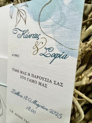 Προσκλητήριο γάμου, μακρόστενη συρταρωτή θήκη, με εκτυπωμένο watrecolor floral σχέδιο, διακοσμημένο με κορδονάκι και κρεμαστό καρτελάκι για τα ονόματα των οικογενειών.