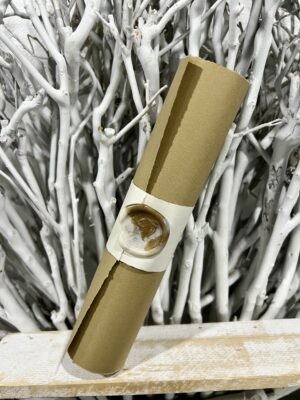 Προσκλητήριο γάμου πάπυρος από 2 οικολογικά χαρτιά σε 2χρωμία καφέ – κρεμ, με χειροποίητο σκίσιμο (deckled edge), χρυσοτυπία στις γωνίες και στα ονόματα, και 2χρωμο βουλοκέρι με τα μονογράμματα.