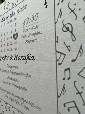 Προσκλητήριο γάμου με υφασμάτινη συρταρωτή θήκη, και κάρτα σε γκοφραρισμένο χαρτί με μουσικό θέμα με νότες.