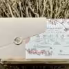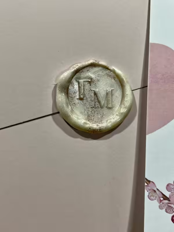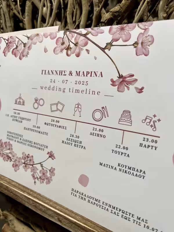 Προσκλητήριο γάμου μεγάλου μεγέθους με φάκελο με πρωτότυπο διαγώνιο κλείσιμο σε nude απόχρωση, σχέδιο αμυγδαλιάς τυπωμένο στην κάρτα, wedding timeline και δίχρωμο βουλοκέρι πέρλα με ροζ γκλίτερ με τα μονογράμματα.
