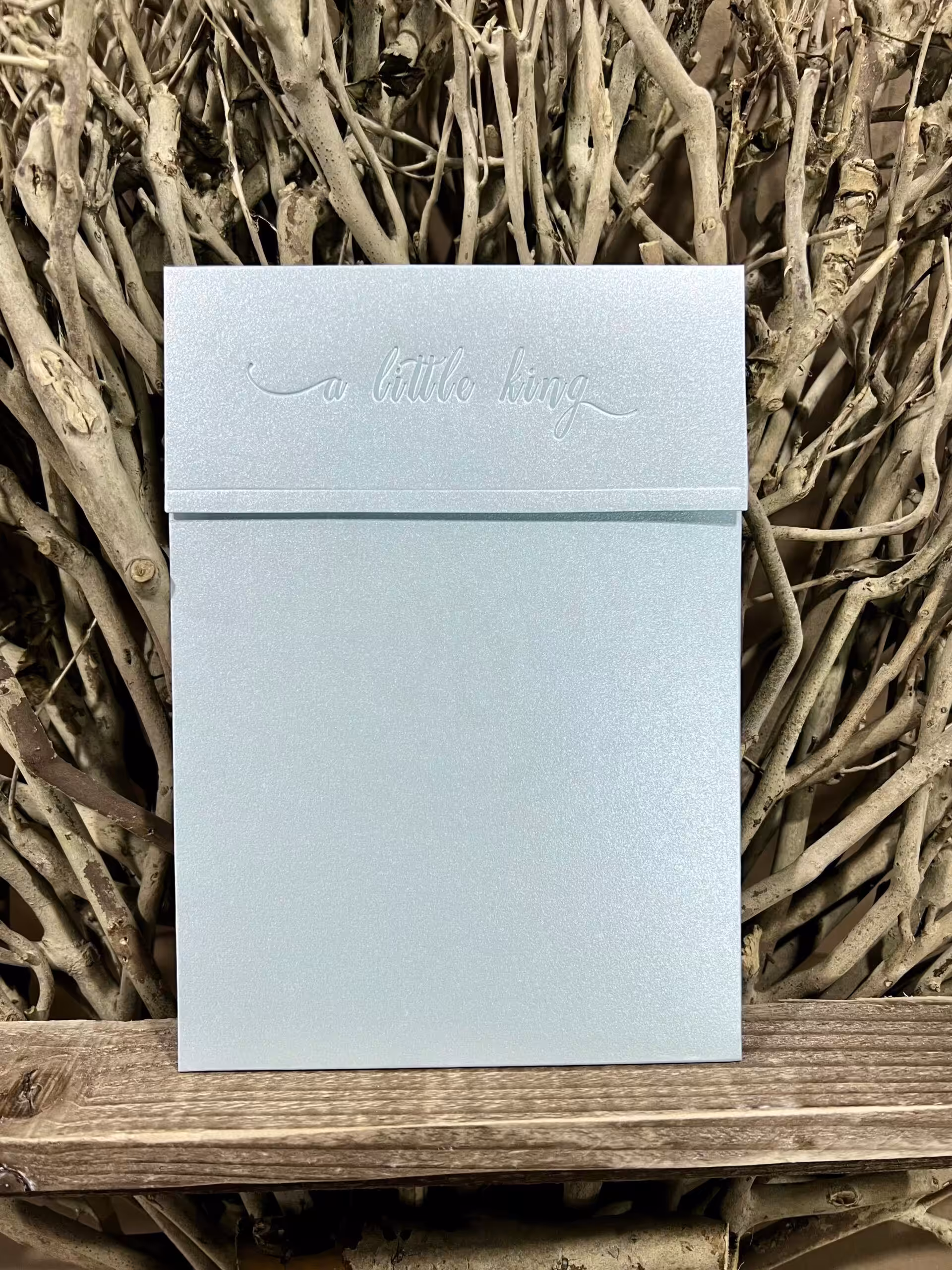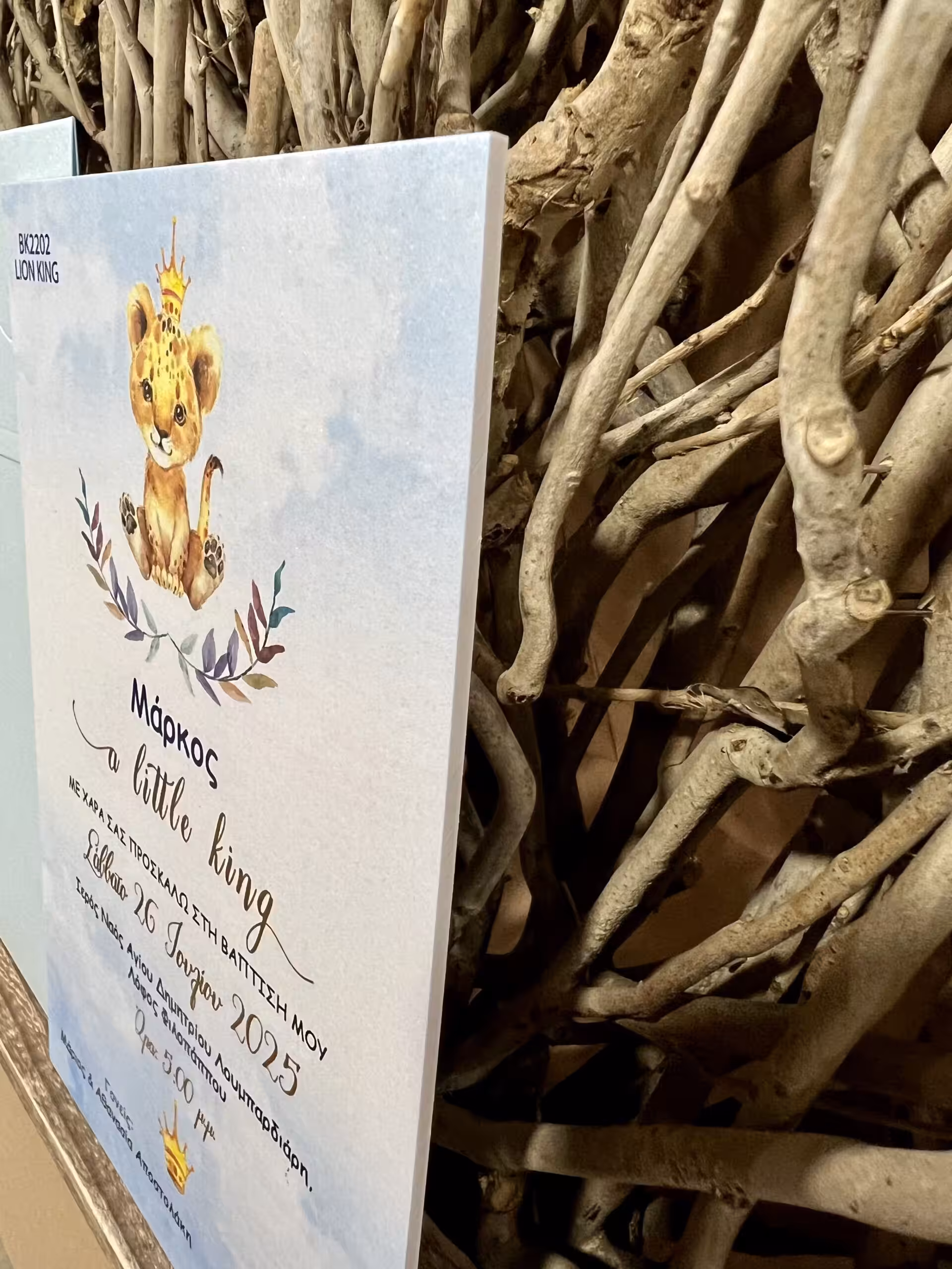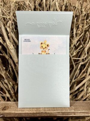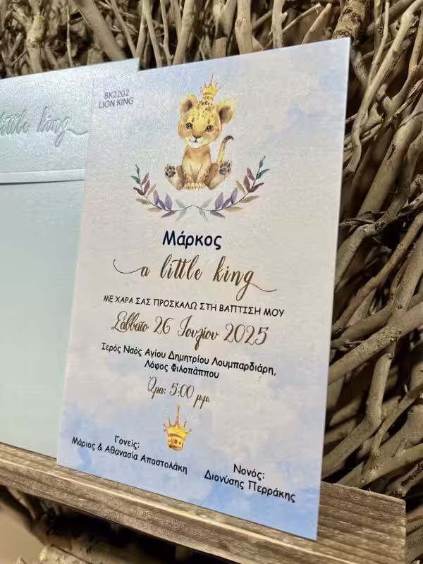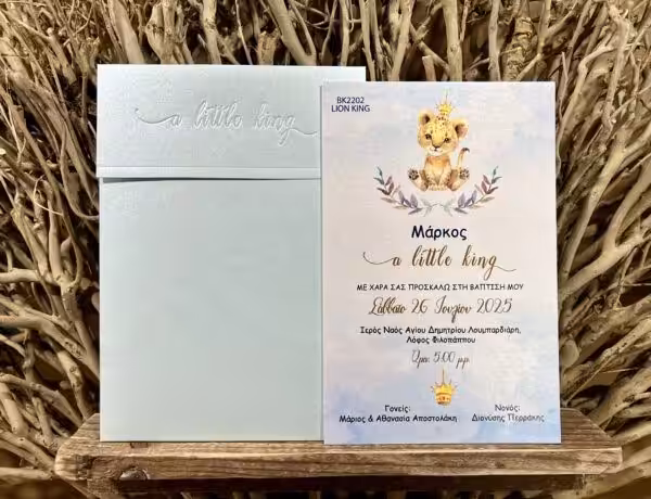 Προσκλητήριο βάπτισης από απλό μέταλ χαρτί ή λαμιναρισμένη χοντρή κάρτα με θέμα Lion King και σχέδιο βαθυτυπίας στον φάκελο.