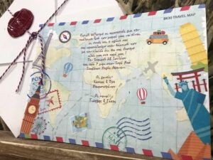 Προσκλητήριο βάπτισης με θέμα ταξίδι, σε οικολογικό χαρτί και βουλοκέρι στο φάκελο.