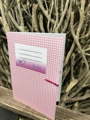 Προσκλητήριο βάπτισης τετράδιο σε χαρτί μέταλ καρό ροζ-λευκό, με αυτοκόλλητη ετικέτα εξωτερικά, και τυπωμένη παιδική μακέτα εσωτερικά, διακοσμημένο με κορδέλα κλεισίματος.