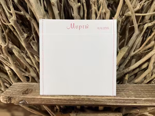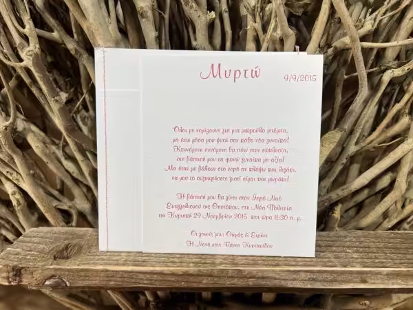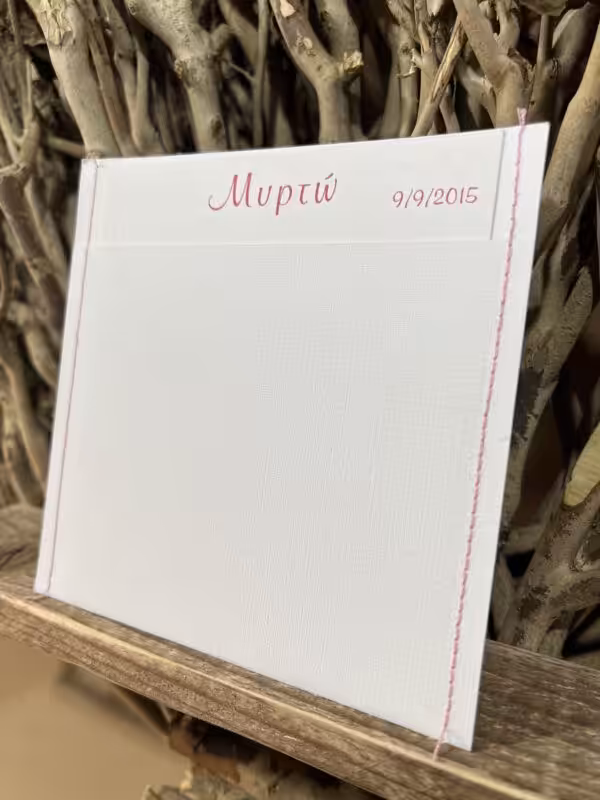 Προσκλητήριο βάπτισης συρταρωτή θήκη σε χαρτί τουάλ λευκό, με ραφές από κλωστή σε ροζ χρώμα.