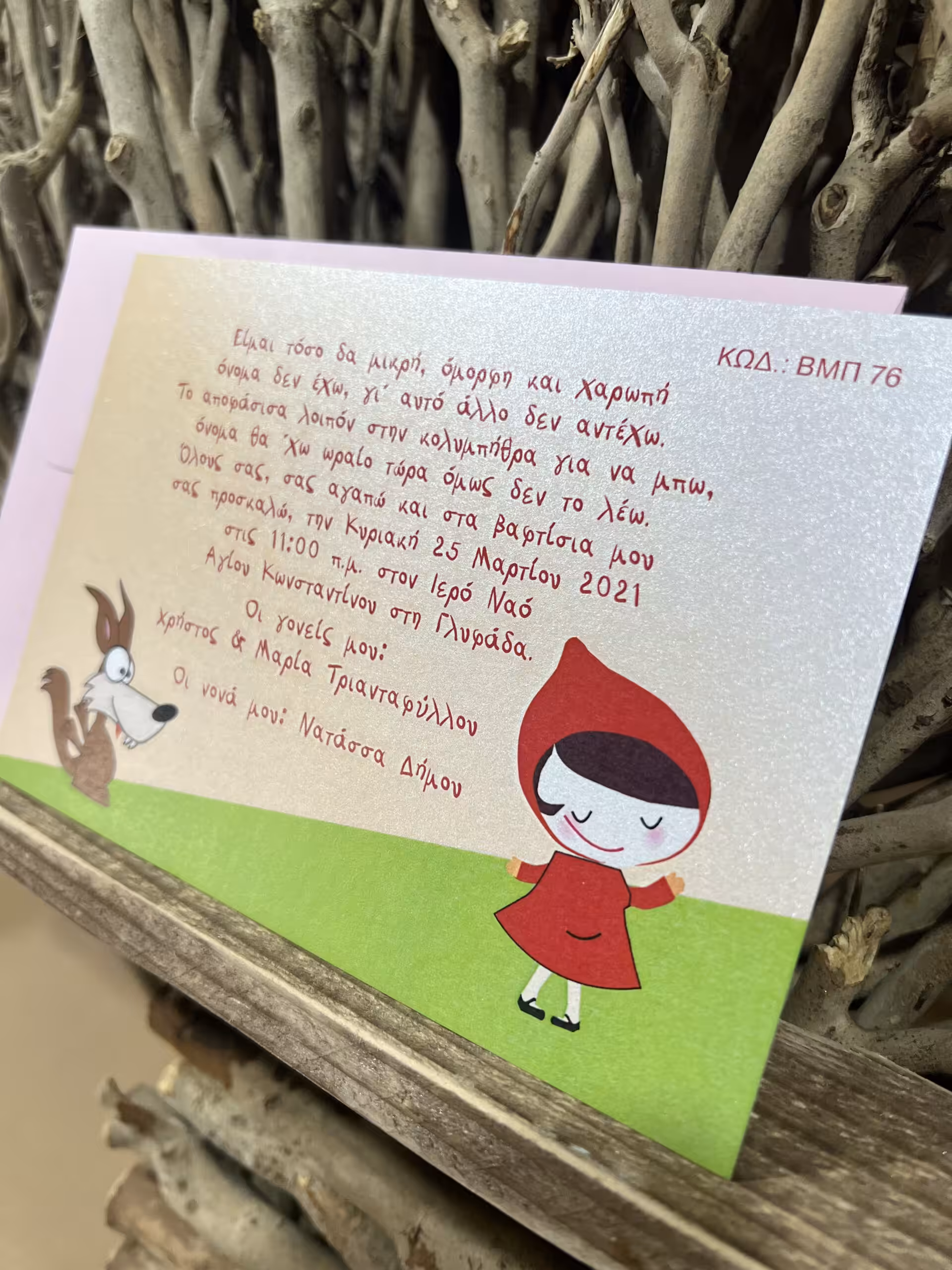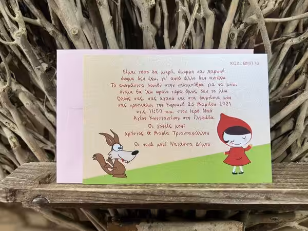 Προσκλητήριο βάπτισης σε μέταλ χαρτί και θέμα κοκκινοσκουφίτσα με φακελάκι, 90 γραμμαρίων.