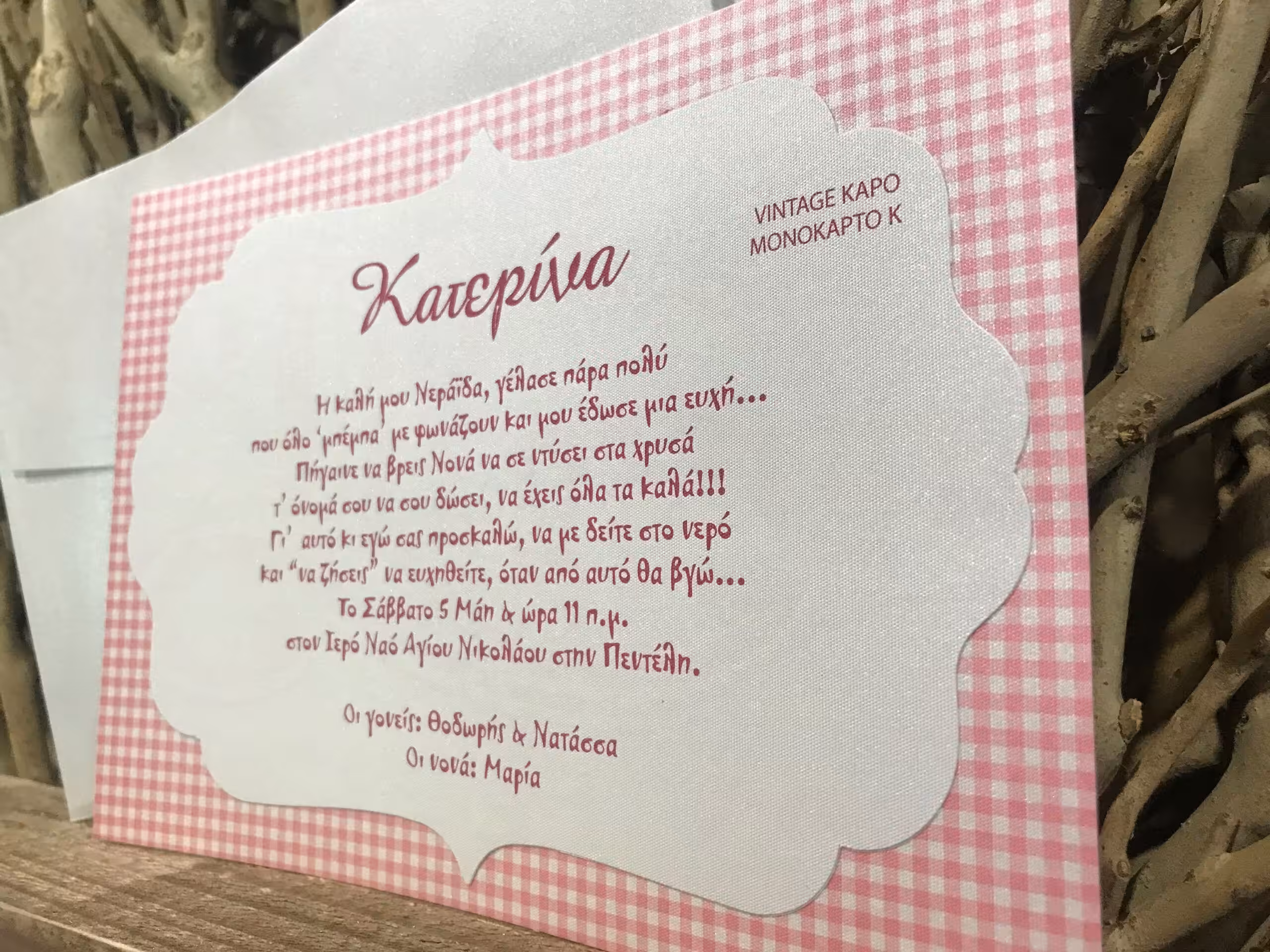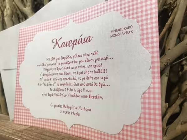 Προσκλητήριο βάπτισης με ντουμπλαρισμένη κάρτα με vintage μορφοκοπή σε χαρτιά μέταλ, με καρό φόντο.