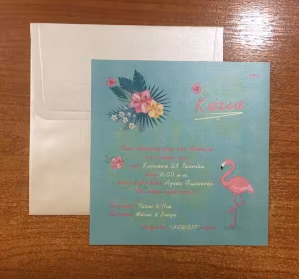 Προσκλητήρια βάπτισης με θέμα Φλαμίγκο, από μέταλ κρεμ χαρτί σε θήκη και κάρτα.